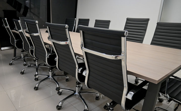 Mesa de juntas con base metálica Alpha color Oxford y cubierta en melamina color precompuesto ceniza, multicontactos que va al centro de la mesa. para dividir se le incluyeron biombos en color gris. por ultimo acompañamos la mesa con las sillas Silla goetz respaldo alto para un mejor resultado.